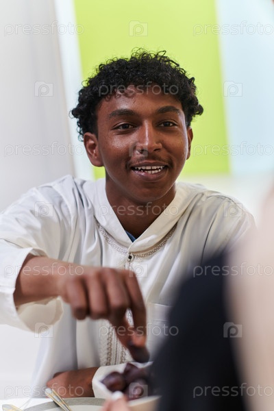 Афроамериканец-мусульманин деликатно выбирает финики, чтобы прервать пост во время месяца Рамадан, сидя за семейным обеденным столом, олицетворяя сцену духовных размышлений, культурных традиций и общего ожидания общего ифтара