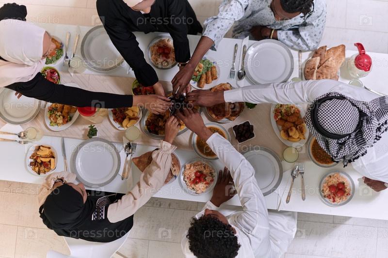 Вид сверху: разные руки мусульманской семьи деликатно сжимают свежие финики, символизируя прекращение поста во время священного месяца Рамадан, запечатлевая момент культурного единства, общих традиций и радостного ожидания общего ифтара