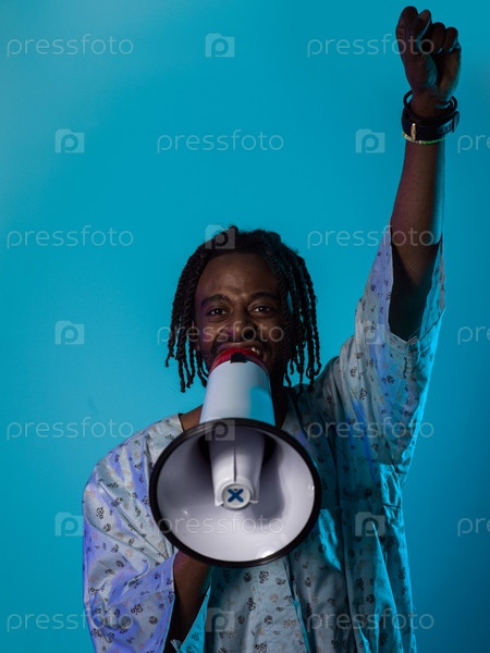 В мощном и символическом образе афроамериканец носит традиционную одежду, страстно размахивает мегафоном на ярком синем фоне, с поднятой рукой в воздухе, символизирующей его вокальные и культурные возможности в стремлении к социальной справедливости и рав