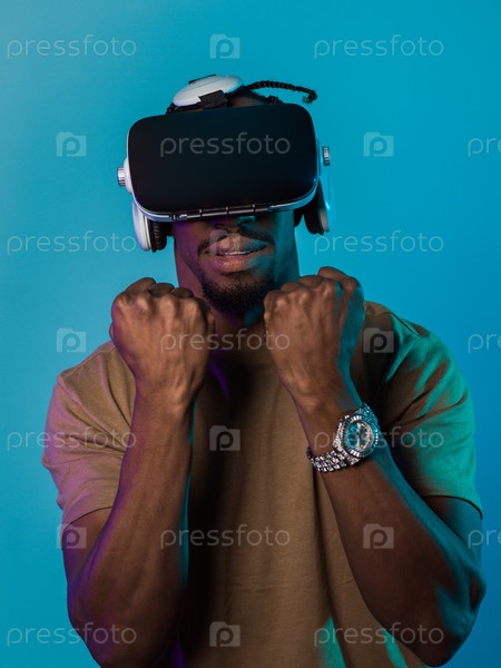 В авангардной сцене афроамериканец участвует в передовых играх виртуальной реальности, используя очки VR для погружения в футуристические боксерские игры, расположенные на ярко-синем фоне, демонстрируя плавное сочетание технологий, инноваций и взаимодейст