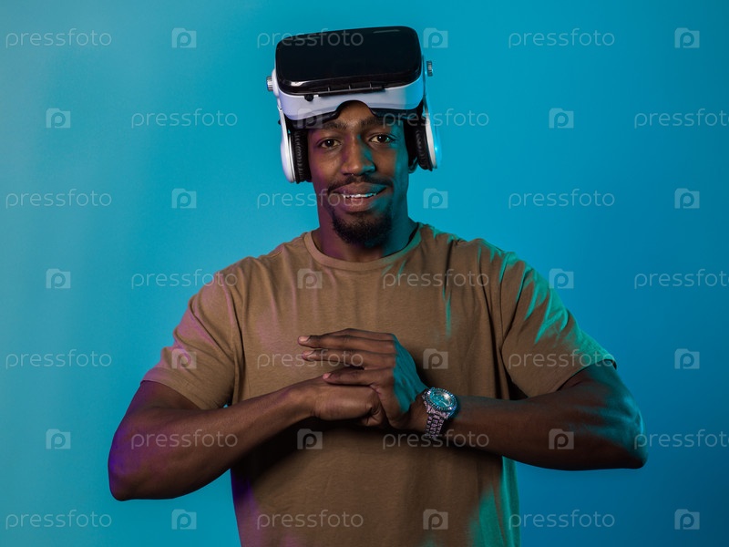 В авангардной сцене афроамериканец участвует в передовых играх виртуальной реальности, используя очки VR для погружения в футуристические боксерские игры, расположенные на ярко-синем фоне, демонстрируя плавное сочетание технологий, инноваций и взаимодейст