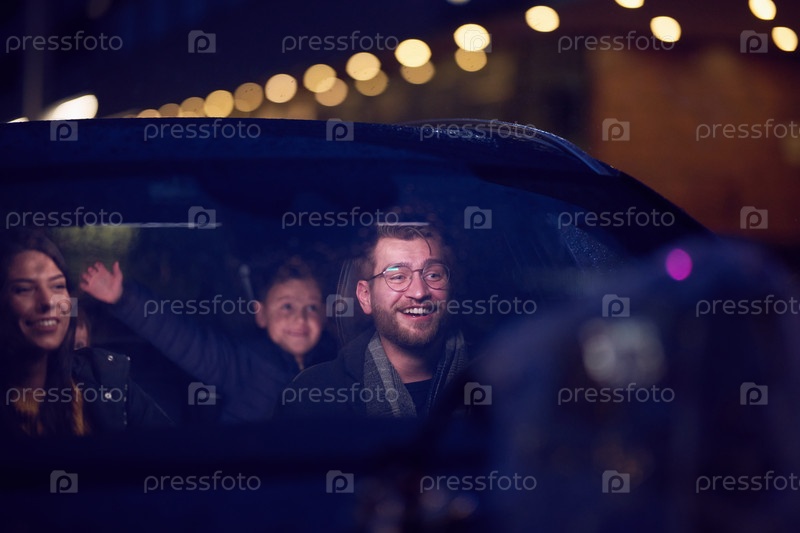 В ночные часы счастливая семья вместе наслаждается игровыми моментами в машине, путешествуя по ночной дороге, освещенной светом фар и наполненной смехом и радостью