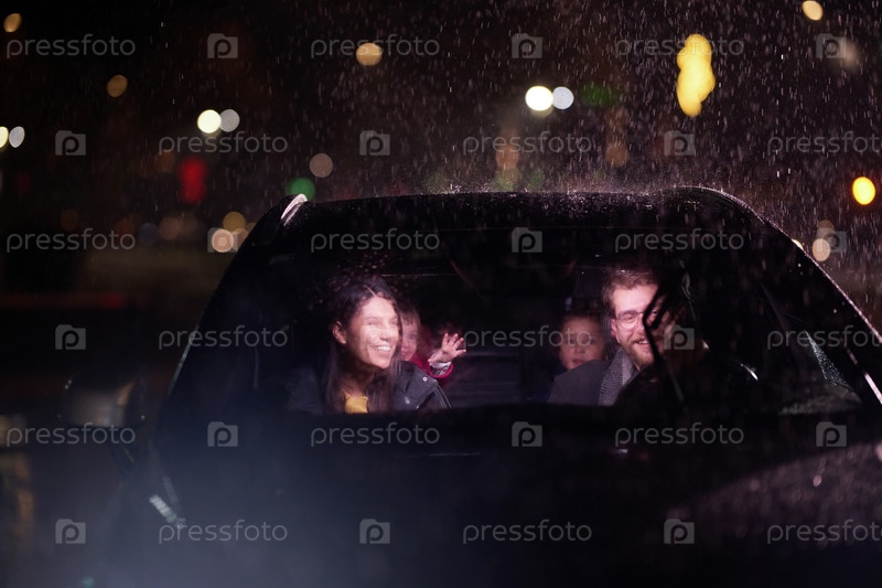 Посреди ночного путешествия счастливая семья наслаждается игровыми моментами в машине, путешествуя в дождливую погоду, освещенная светом фар, смехом и сплочением