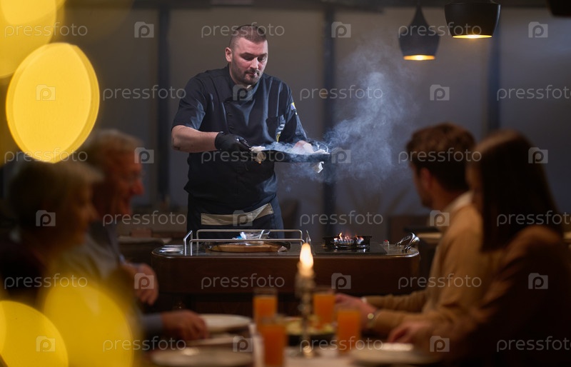 В ресторане профессиональный шеф-повар предлагает шипящий стейк, приготовленный на открытом огне, в то время как европейская мусульманская семья с нетерпением ждет ифтара во время священного месяца Рамадан, сочетая кулинарное мастерство с культурными трад