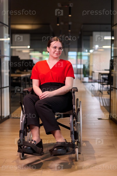 Современная молодая деловая женщина в инвалидной коляске окружена инклюзивным рабочим пространством со стеклянными стенами офисов, олицетворяющим решимость и новаторство в деловом мире