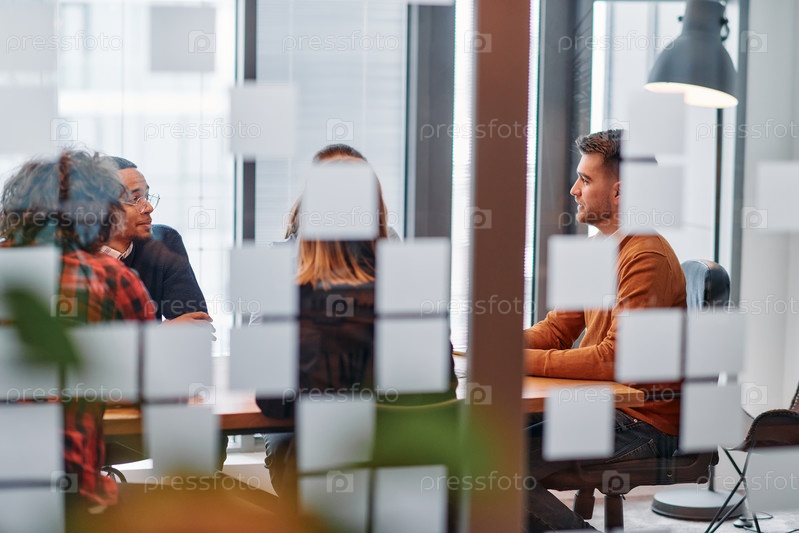 В элегантном стеклянном офисе команда профессионалов бизнеса участвует в оживленных дискуссиях и обменивается стратегическими идеями, демонстрируя сотрудничество и инновации, лежащие в основе современной корпоративной культуры