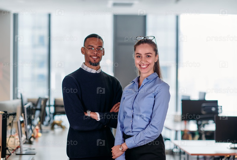 Динамичное деловое сотрудничество: блондинка-бизнесмен и афроамериканская коллега в современном офисе