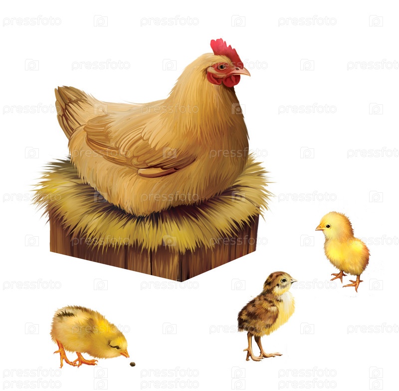 Курица на насесте и три цыпленка