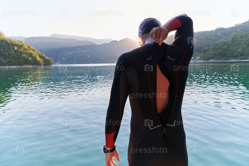 Настоящий спортсмен по триатлону готовится к тренировке по плаванию на озере