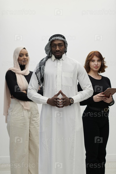 Арабский бизнесмен уверенно стоит рядом с двумя деловыми женщинами, изображая уравновешенную и разнообразную команду, олицетворяющую амбиции, инновации и дальновидное лидерство на первозданном белом фоне