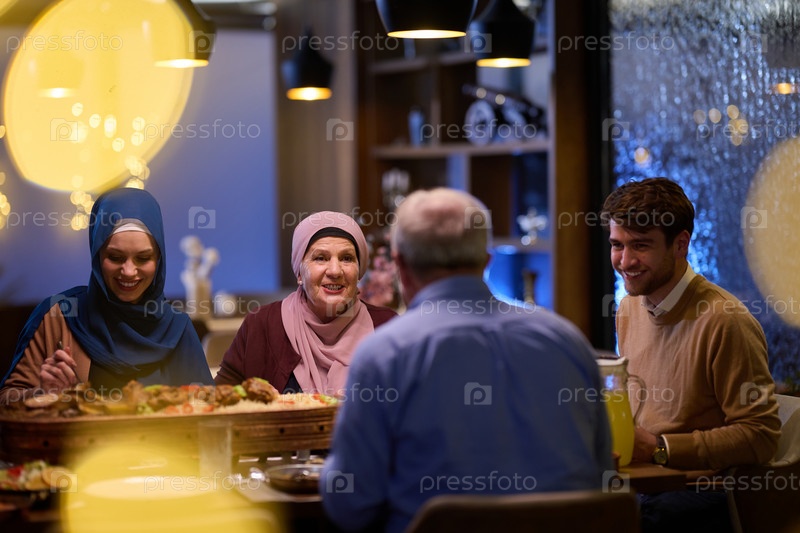 Современная и традиционная европейская исламская семья собирается вместе на ифтар в современном ресторане во время поста Рамадан, олицетворяя культурную гармонию и семейное единство среди кулинарного праздника разнообразия