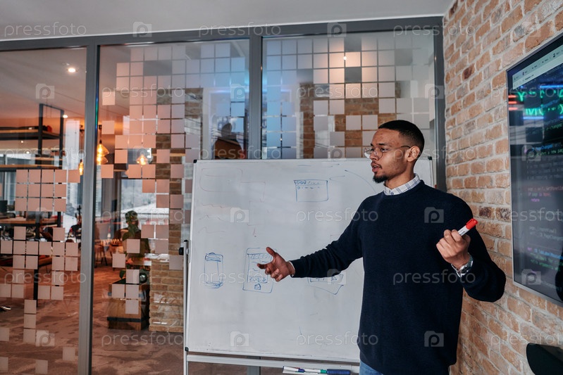 Афроамериканский бизнесмен убедительно презентует свою бизнес-стратегию своим коллегам, способствуя сотрудничеству и дальновидному мышлению