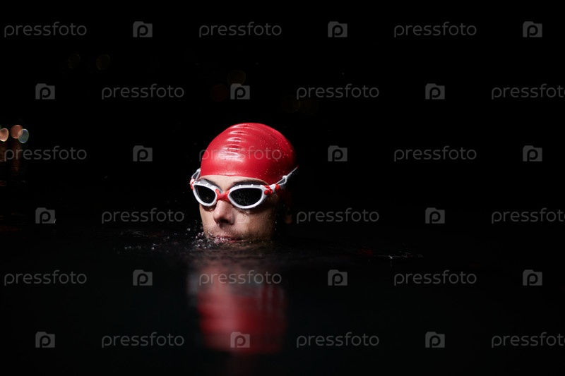 Решительный профессиональный триатлонист проходит тщательную ночную тренировку в холодной воде, демонстрируя преданность делу и стойкость в подготовке к предстоящим соревнованиям по триатлону по плаванию