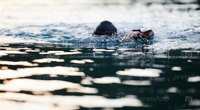 Спортсмен по триатлону плавает на озере на рассвете в гидрокостюме