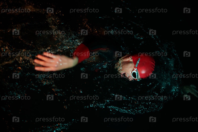 Решительный профессиональный триатлонист проходит тщательную ночную тренировку в холодной воде, демонстрируя преданность делу и стойкость в подготовке к предстоящим соревнованиям по триатлону по плаванию