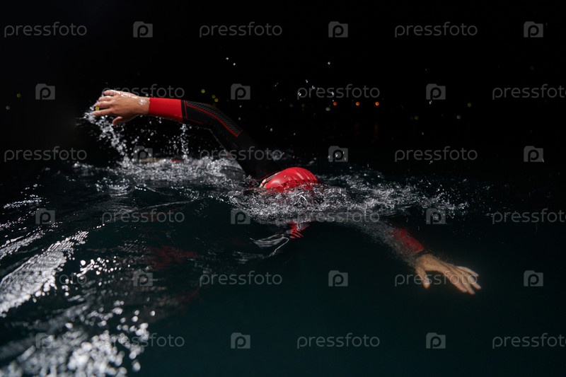 Решительный профессиональный триатлонист проходит тщательную ночную тренировку в холодной воде, демонстрируя преданность делу и стойкость в подготовке к предстоящим соревнованиям по триатлону по плаванию