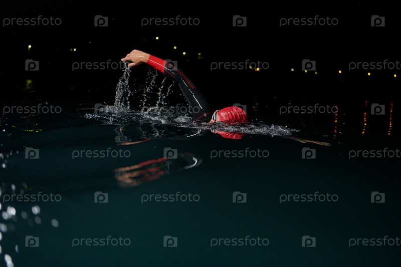Решительный профессиональный триатлонист проходит тщательную ночную тренировку в холодной воде, демонстрируя преданность делу и стойкость в подготовке к предстоящим соревнованиям по триатлону по плаванию