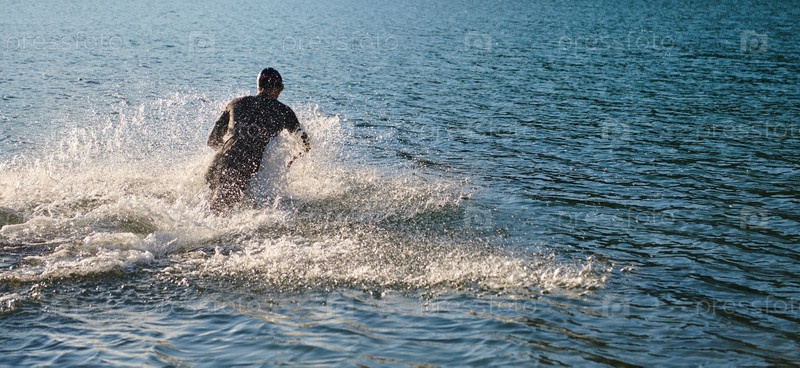 Спортсмен по триатлону начинает тренировку по плаванию на озере