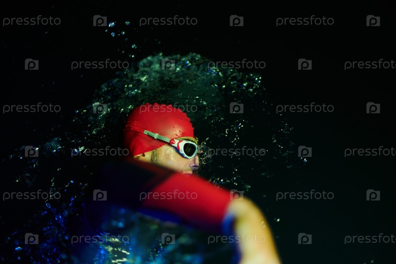 Настоящий пловец-триатлет, отдыхающий во время тяжелых тренировок при ночном неоновом гелевом свете