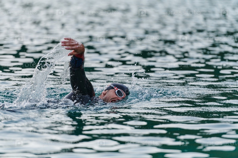 Профессиональный триатлонист с непоколебимой преданностью тренируется перед предстоящими соревнованиями на озере, излучая чувство атлетизма и глубокое стремление к совершенству