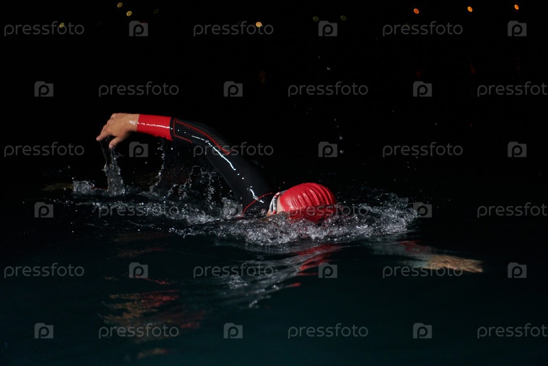 Решительный профессиональный триатлонист проходит тщательную ночную тренировку в холодной воде, демонстрируя преданность делу и стойкость в подготовке к предстоящим соревнованиям по триатлону по плаванию
