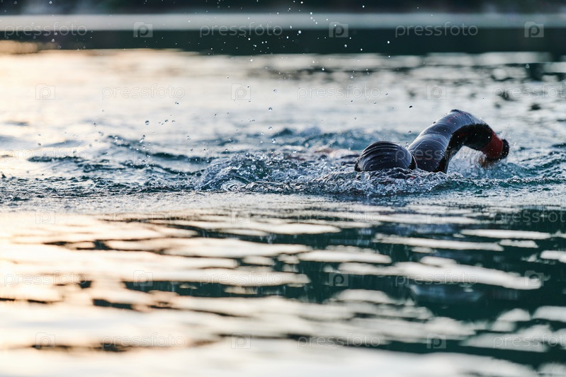 Спортсмен по триатлону плавает на озере на рассвете в гидрокостюме