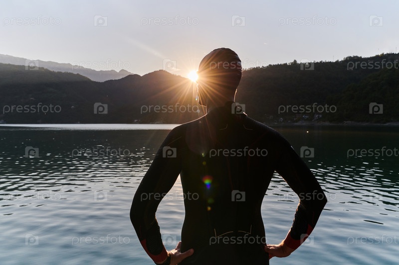 Настоящий спортсмен по триатлону готовится к тренировке по плаванию на озере