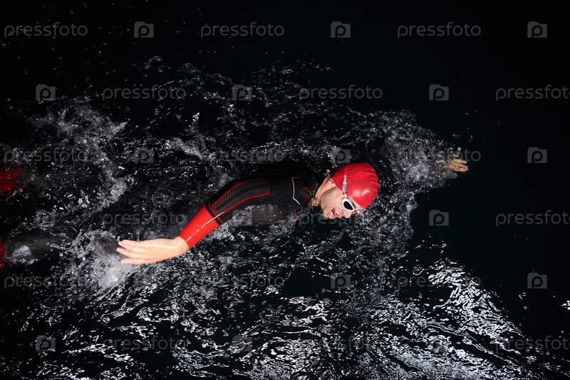 Решительный профессиональный триатлонист проходит тщательную ночную тренировку в холодной воде, демонстрируя преданность делу и стойкость в подготовке к предстоящим соревнованиям по триатлону по плаванию
