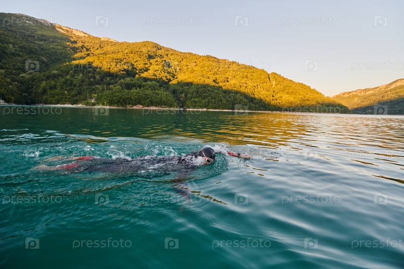 Спортсмен по триатлону плавает на озере на рассвете в гидрокостюме