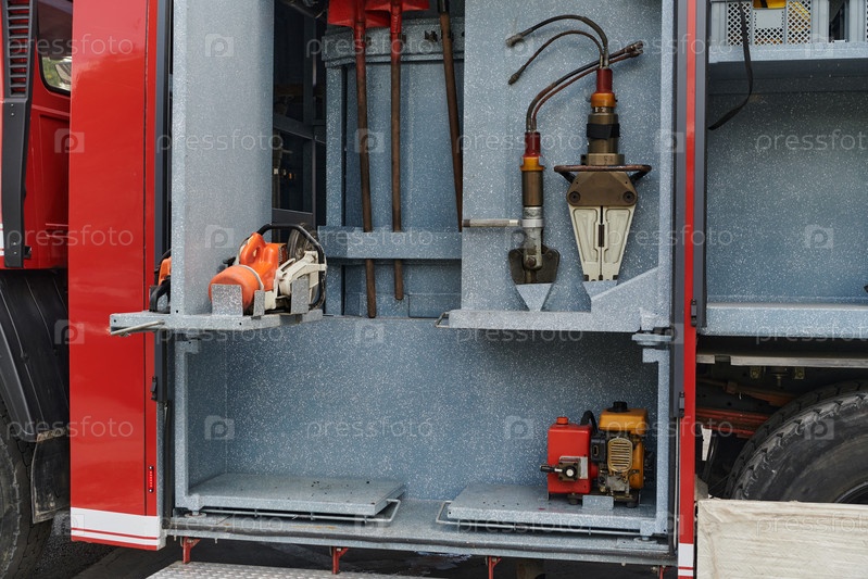 Крупный план основного противопожарного оборудования на современной пожарной машине, демонстрация инструментов и снаряжения, готовых к экстренному реагированию на опасные пожарные ситуации