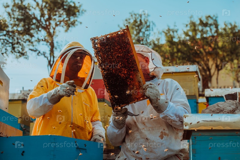 Пчеловоды проверяют мед на рамке улья в поле. Владельцы малого бизнеса на пасеке. Производитель натуральных здоровых продуктов питания работает с пчелами и ульями на пасеке