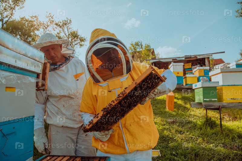 Пчеловоды проверяют мед на рамке улья в поле. Пчеловоды проверяют качество меда и наличие в нем паразитов. Пчеловод работает с пчелами и ульями на пасеке