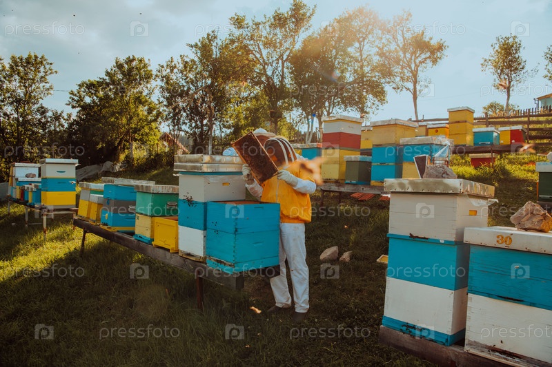 Пчеловоды проверяют мед на рамке улья в поле. Владельцы малого бизнеса на пасеке. Производитель натуральных здоровых продуктов питания работает с пчелами и ульями на пасеке
