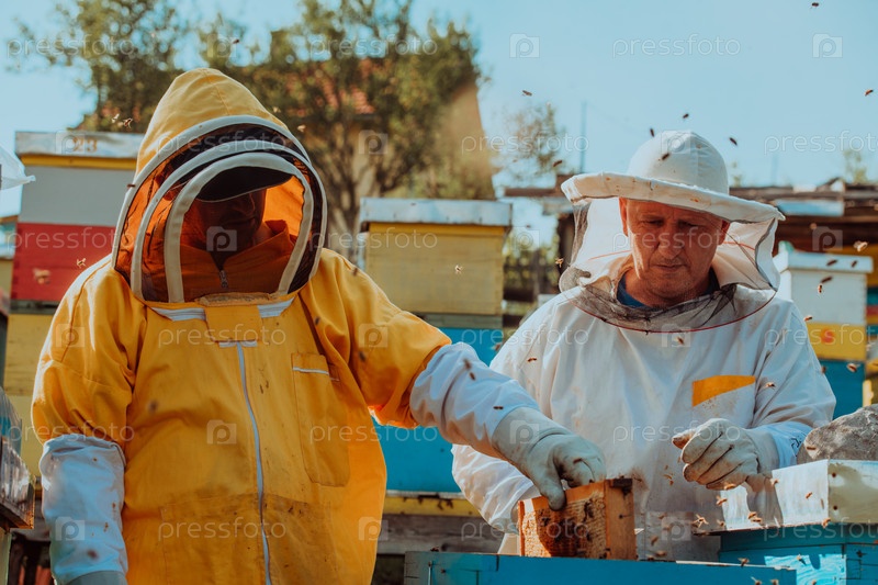 Пчеловоды проверяют мед на рамке улья в поле. Владельцы малого бизнеса на пасеке. Производитель натуральных здоровых продуктов питания работает с пчелами и ульями на пасеке