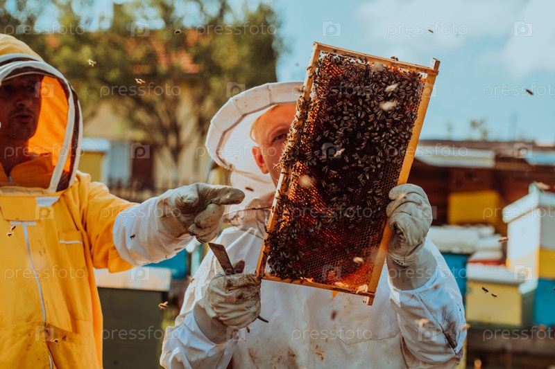 Пчеловоды проверяют мед на рамке улья в поле. Владельцы малого бизнеса на пасеке. Производитель натуральных здоровых продуктов питания работает с пчелами и ульями на пасеке