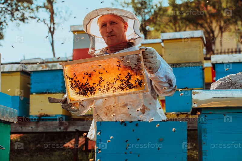 Пчеловод проверяет мед на рамке улья в поле. Владелец малого бизнеса на пасеке. Производитель натуральных здоровых продуктов питания работает с пчелами и ульями на пасеке