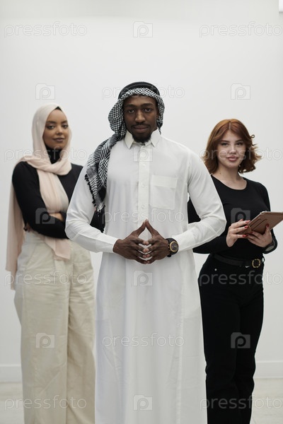 Арабский бизнесмен уверенно стоит рядом с двумя деловыми женщинами, изображая уравновешенную и разнообразную команду, олицетворяющую амбиции, инновации и дальновидное лидерство на первозданном белом фоне