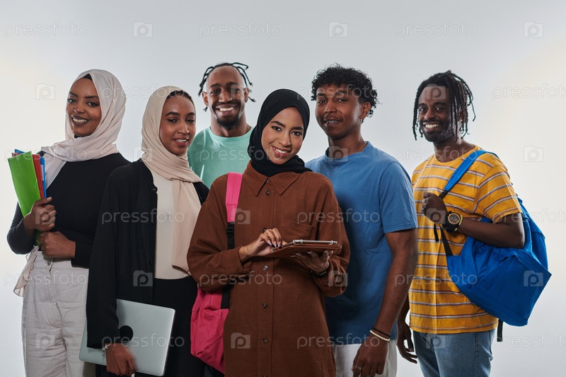 Группа разнообразных студентов занимается современными образовательными практиками, используя различные технологические инструменты, такие как ноутбуки, планшеты и смартфоны, на чистом белом фоне, иллюстрируя современный подход к совместному обучению и до