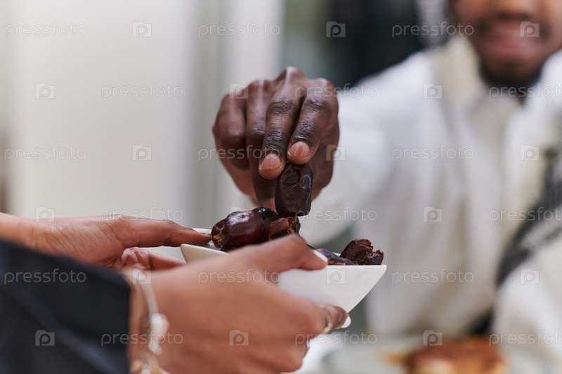 Афроамериканец-мусульманин деликатно выбирает финики, чтобы прервать пост во время месяца Рамадан, сидя за семейным обеденным столом, олицетворяя сцену духовных размышлений, культурных традиций и общего ожидания общего ифтара