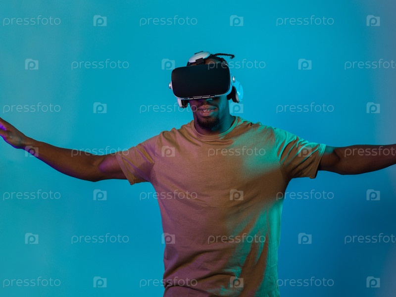 Афроамериканец надевает очки виртуальной реальности, поглощенный симуляцией виртуальной реальности, жестикулируя руками на ярком синем фоне, подчеркивая сочетание передовых технологий и интерактивного взаимодействия