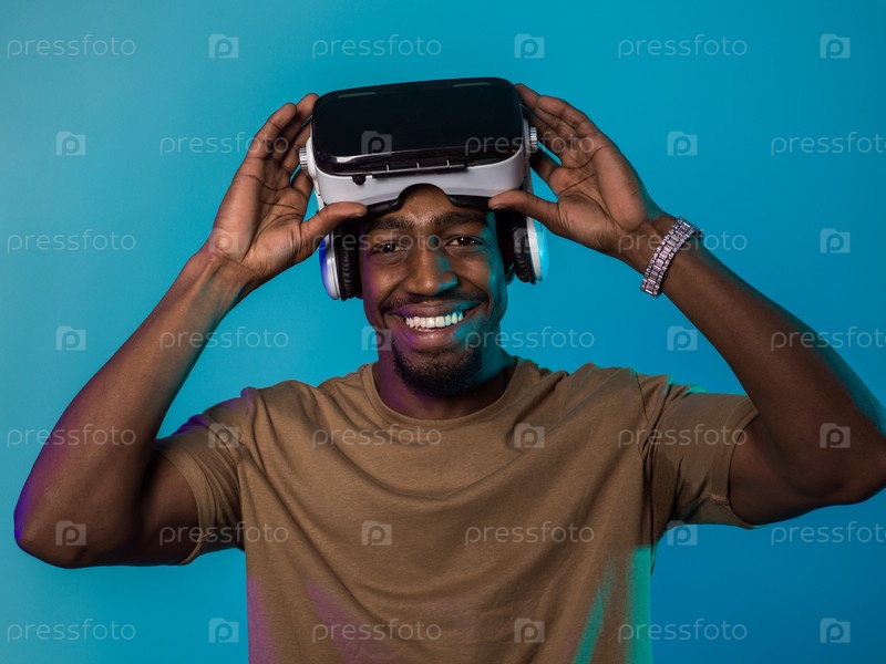 В футуристическом изображении афроамериканец стоит изолированно на ярком синем фоне, украшенный очками виртуальной реальности, которые переносят его в передовую виртуальную реальность, объединяя технологии и инновации на современном дисплее
