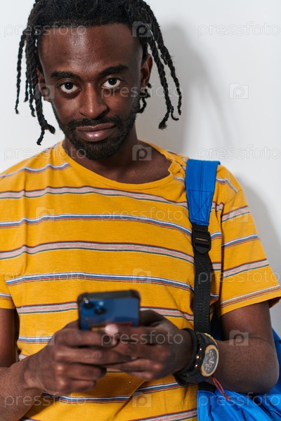 Афроамериканский подросток пользуется своим смартфоном на девственно белом фоне, воплощая суть современных цифровых технологий и молодежной культуры