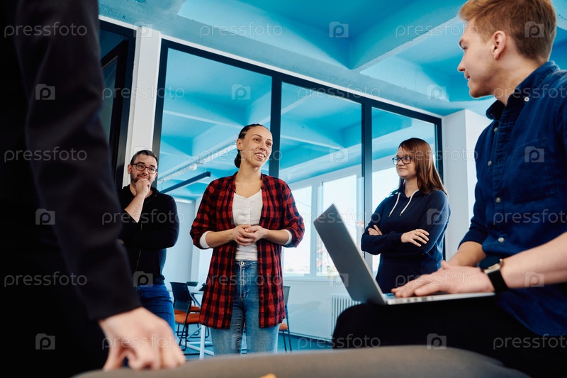 Разнообразная команда молодых бизнесменов, обменивающихся идеями в современном стартап-офисе