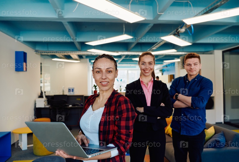 Молодая команда бизнес-профессионалов позирует для портрета офиса стартапа, излучая уверенность и амбиции, при этом одна женщина держит ноутбук, что символизирует инновации и сотрудничество в предпринимательстве
