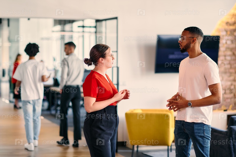 Молодые коллеги по бизнесу, в том числе афроамериканский бизнесмен, обсуждают деловые вопросы в коридоре современного коворкинг-центра, демонстрируя динамичное решение проблем и сотрудничество
