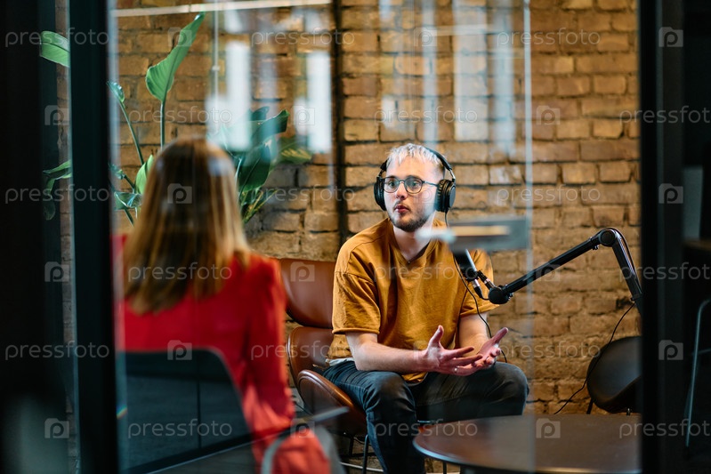 Собрание молодых бизнес-профессионалов, некоторые из которых сидят в офисе со стеклянными стенами, ведут оживленную беседу и записывают онлайн-подкаст, олицетворяющий современное сотрудничество и динамичное взаимодействие