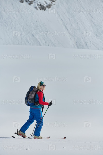 Женщина-альпинистка поднимается в Альпы со снаряжением для бэккантри