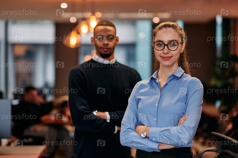 Цифровое сотрудничество: блондинка-бизнесмен и афроамериканский партнер просматривают документы в Интернете
