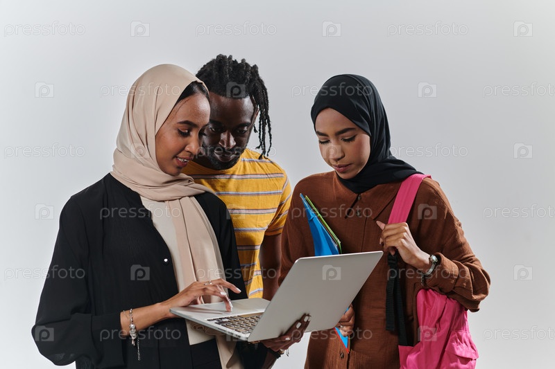 Группа студентов, в том числе афроамериканская студентка и две женщины в хиджабах, стоят вместе на первозданном белом фоне, символизируя гармоничное сочетание культур и традиций в стремлении к знаниям и академическому совершенству