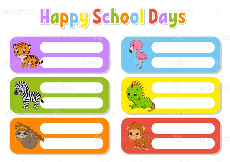 Яркие наклейки. Прямоугольная этикетка. Симпатичные персонажи. Цветовая векторная изолированная иллюстрация